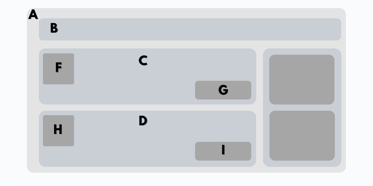 As you can see, components can be a part of other components, and also can contain other components. We can refer to the components as parent and child components, depending on where they are located. On the illustration above, component A is a parent component to the components B, C, and D, and component C is a parent of the components F and G. Components B, C, D are child components of component A, and F and G are child components of component C.
